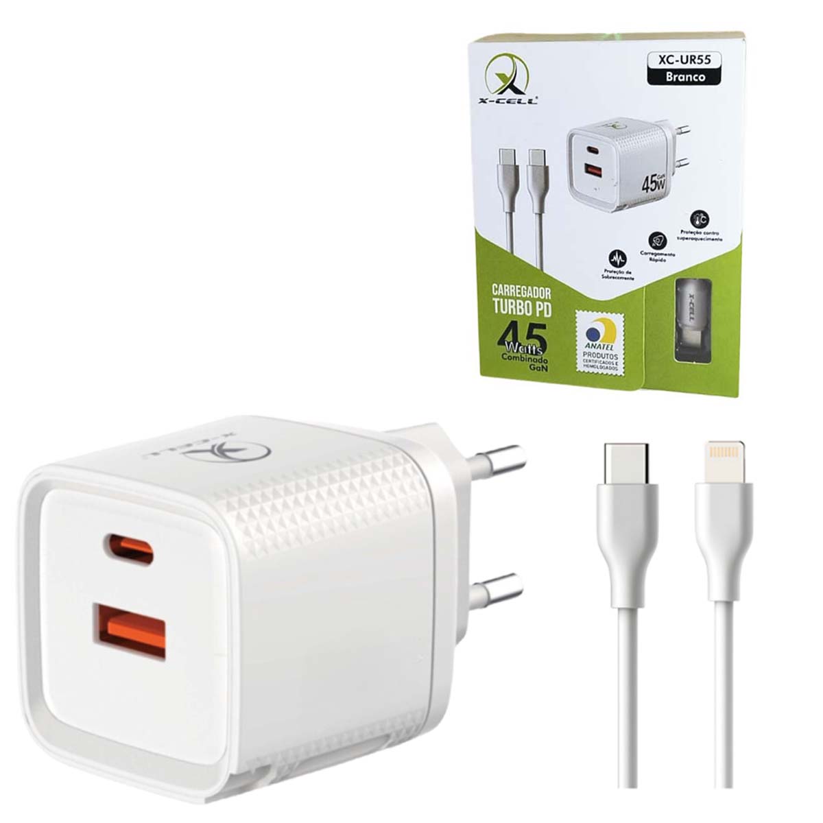Carregue seus dispositivos com rapidez e segurança com o Kit Carregador GAN Turbo 45W. Compacto e eficiente, oferece saída USB-C e USB-A, além de um cabo Lightning para iphone x 11 12 13 14 de 1 metro. Ideal para carregar smartphones, tablets e outros dispositivos com alta potência, proteção contra sobrecarga e superaquecimento.