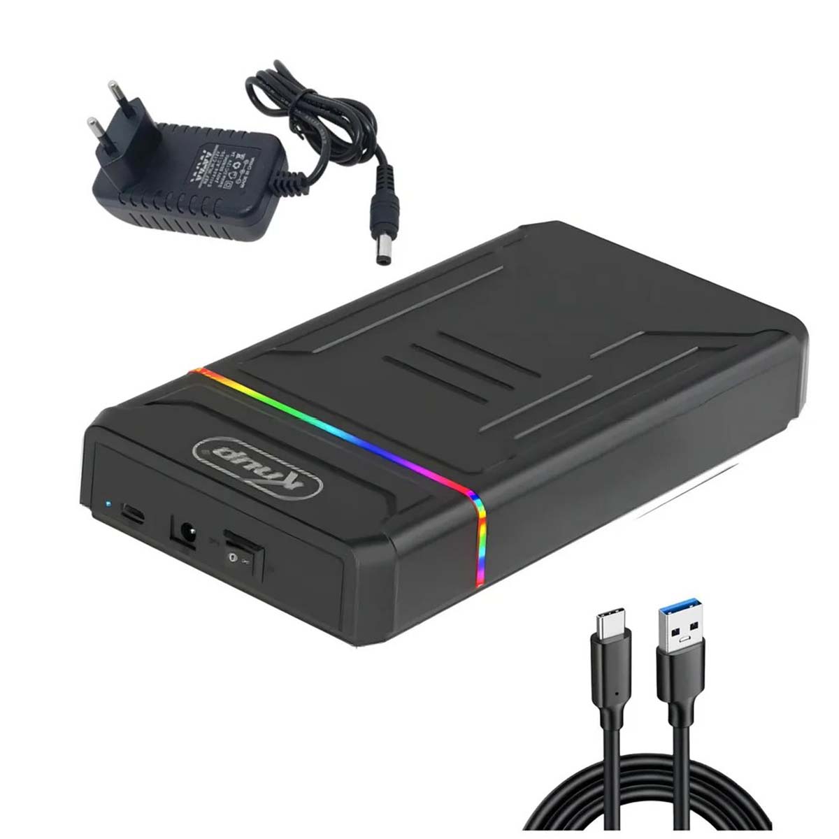 Além de sua funcionalidade, o Case Knup HD843 conta com iluminação RGB decorativa oscilante, que agrega um toque moderno e estiloso ao seu setup gamer ou ambiente de trabalho. Com fonte de alimentação de 12V, ele garante um desempenho estável, mesmo com discos de maior capacidade.