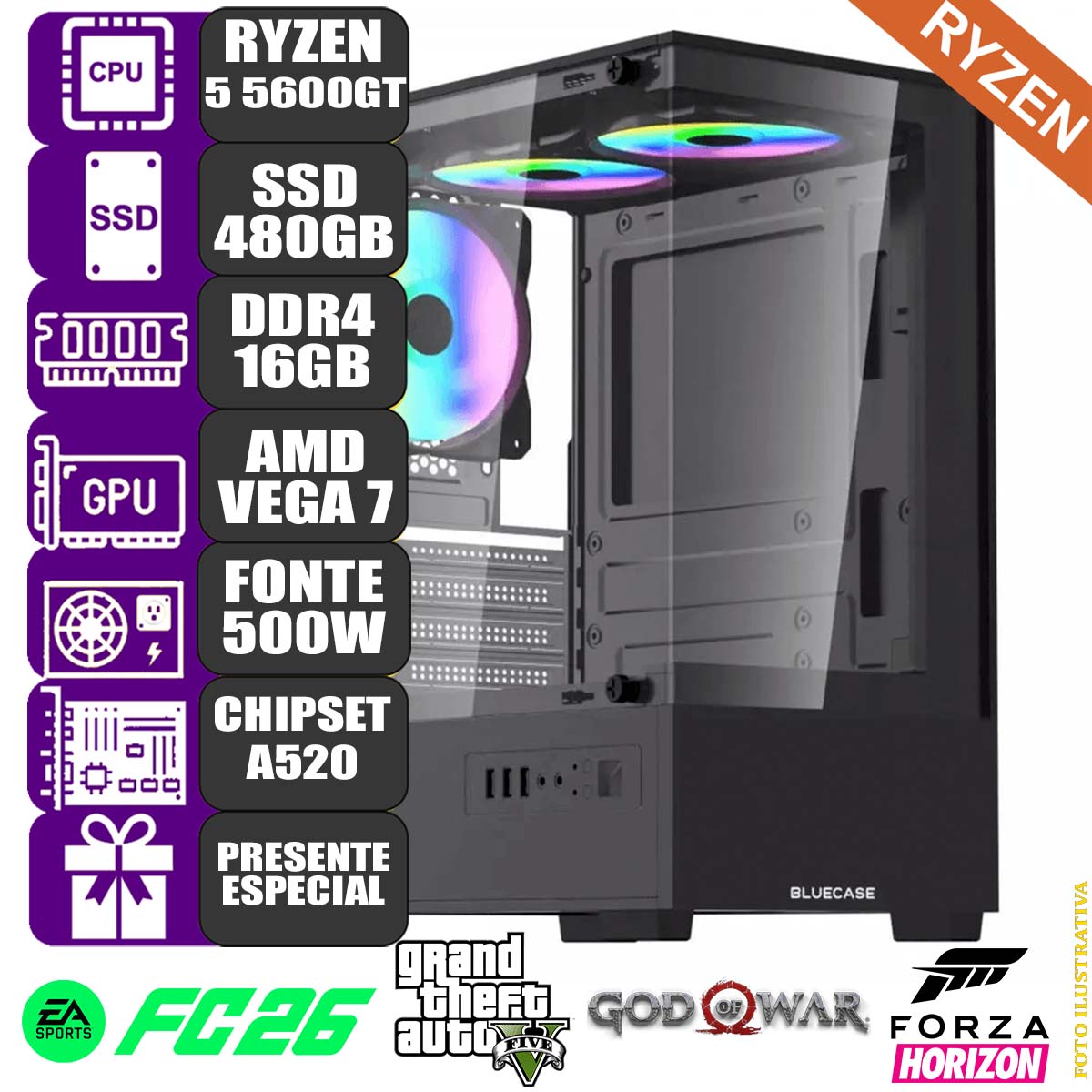 - **Processador:** Processador AMD Ryzen 5 5600GT, 3.6 GHz, (4.6GHz Max Turbo), Cache 4MB, 6 Núcleos, 12 Threads, AM4