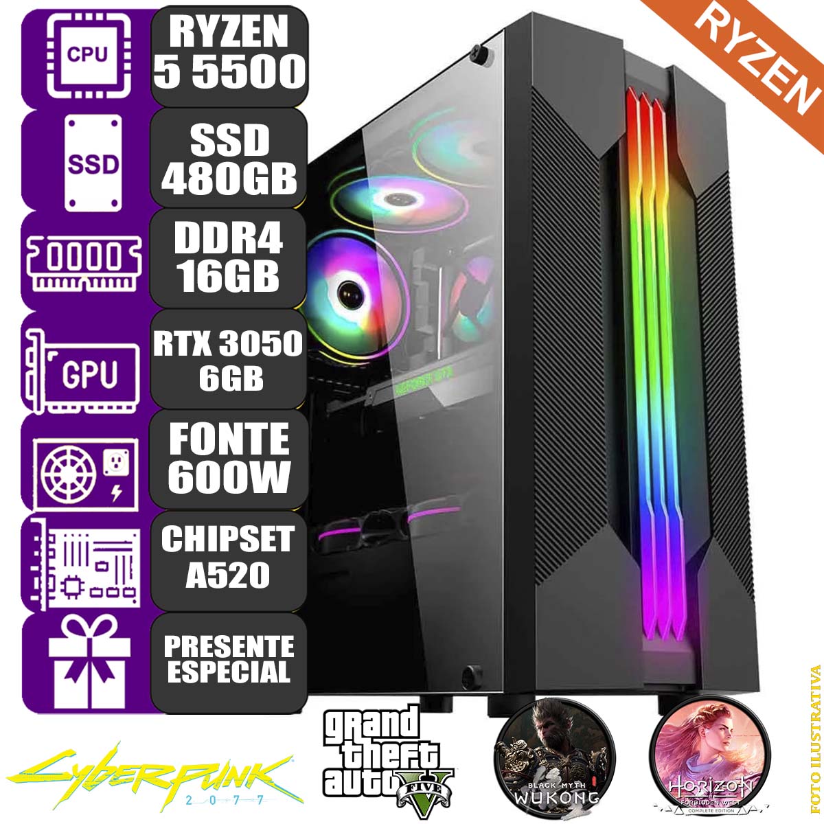 - **Processador:** AMD Ryzen 5 5500 (6 núcleos, 3,6 GHz com Turbo de até 4,1 GHz, Cache de 11MB, AM4)