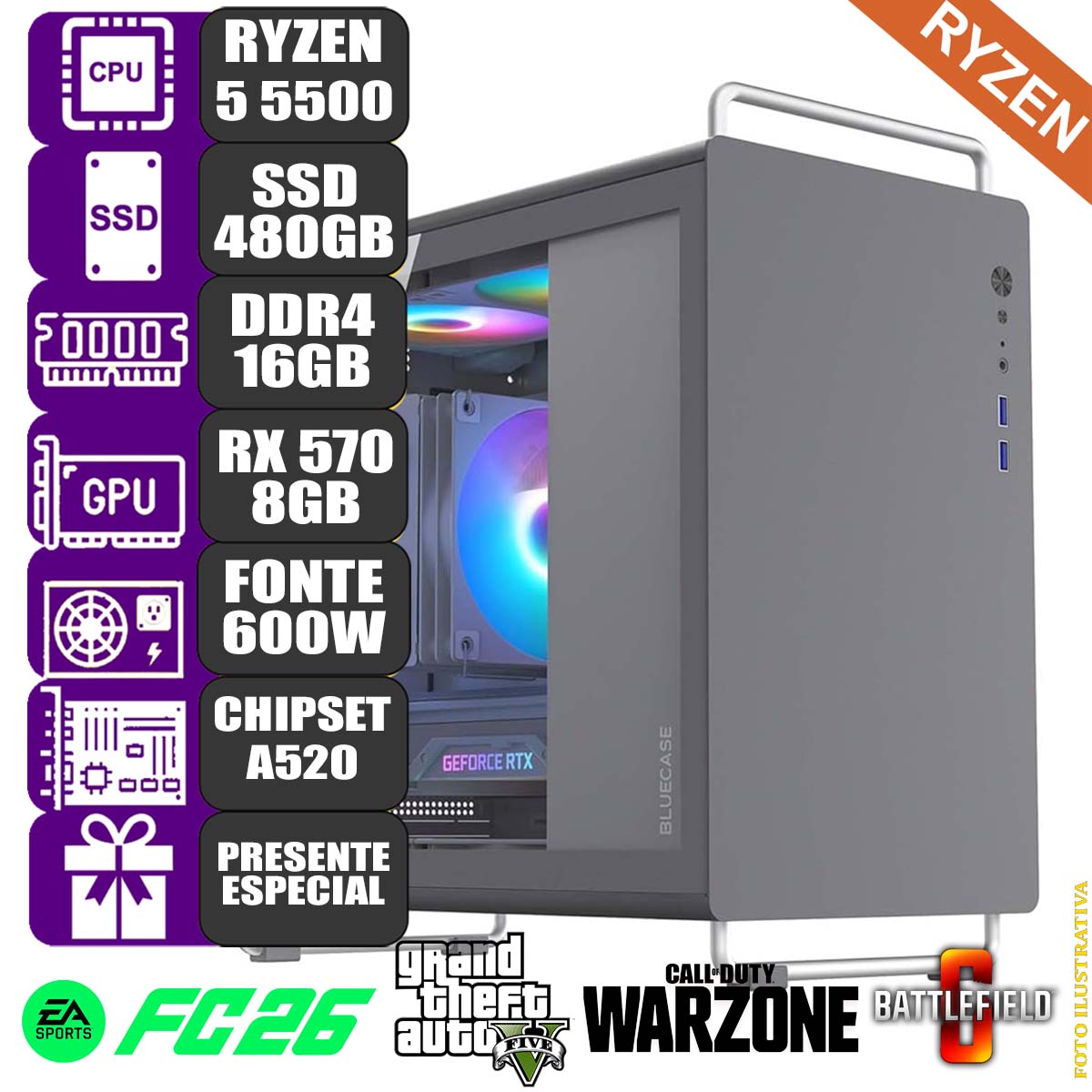 - Desempenho otimizado para jogos simples, RPG e FPS, com a potente placa de vídeo RX 570 8GB.