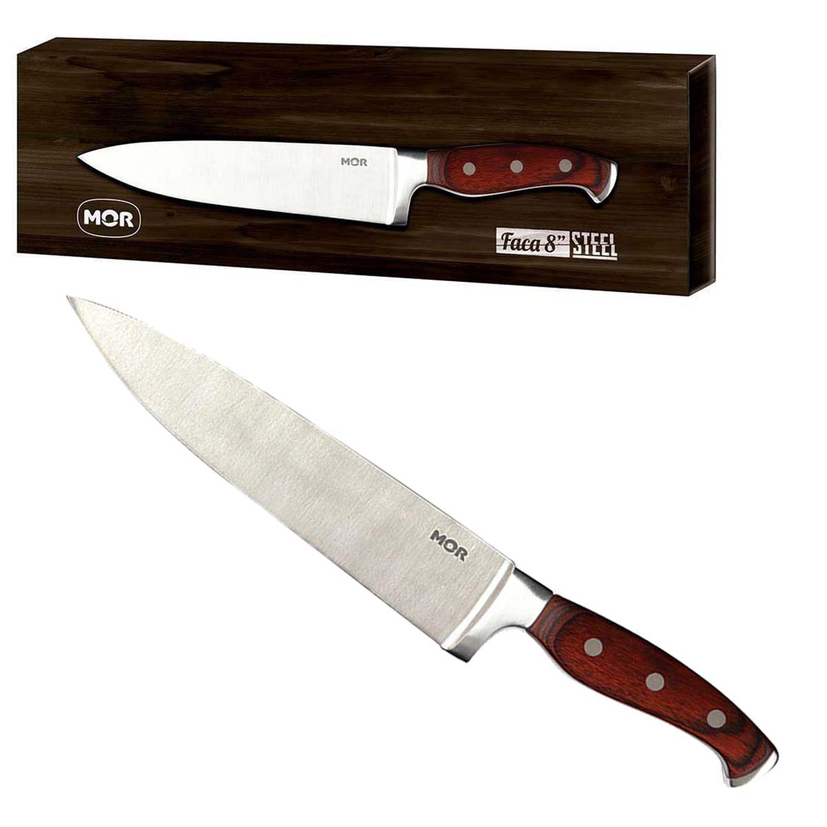 As facas da linha Steel tem design sofisticado e atraente. Com cabo em madeira e lâmina afiada em Aço inox, são leves e de fácil manuseio, perfeitas para auxiliar nas tarefas da cozinha. Com caixa colorida e bem trabalhada, é uma excelente opção para dar de presente.