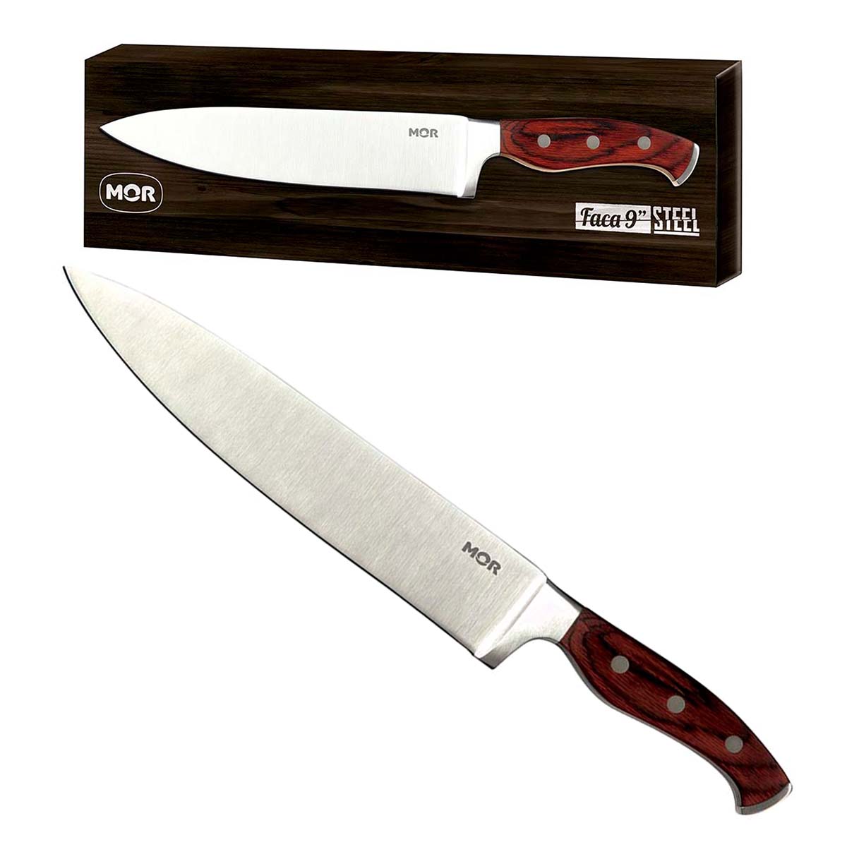 A Faca 9 da linha Steel da Mor tem design sofisticado e atraente. Com cabo em madeira tratada e lâmina afiada em aço inoxidável, é leve, resistente e de fácil manuseio, perfeita para auxiliar nas tarefas da cozinha. Elegância e bom gosto embalado em uma caixa colorida e bem trabalhada, sendo uma excelente opção para presente.