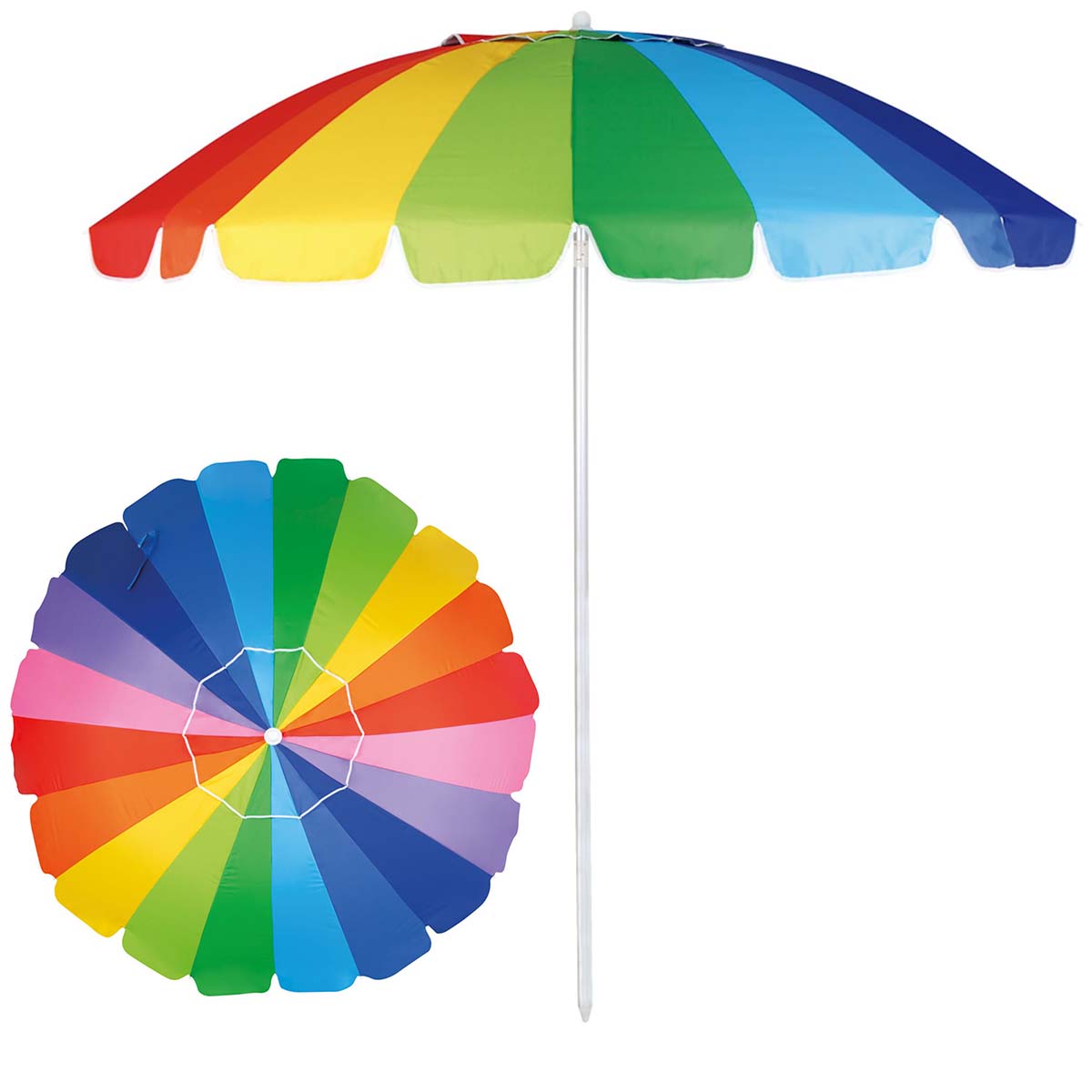 Fabricado em poliéster com revestimento em silver coating, o Guarda-Sol Rainbow possui um fator de proteção solar (FPS) de 100, oferecendo uma defesa eficaz contra os raios UV. As hastes são feitas de alumínio escovado, enquanto as varetas são em aço pintado, e os rebites são em aço, garantindo resistência e durabilidade excepcionais.