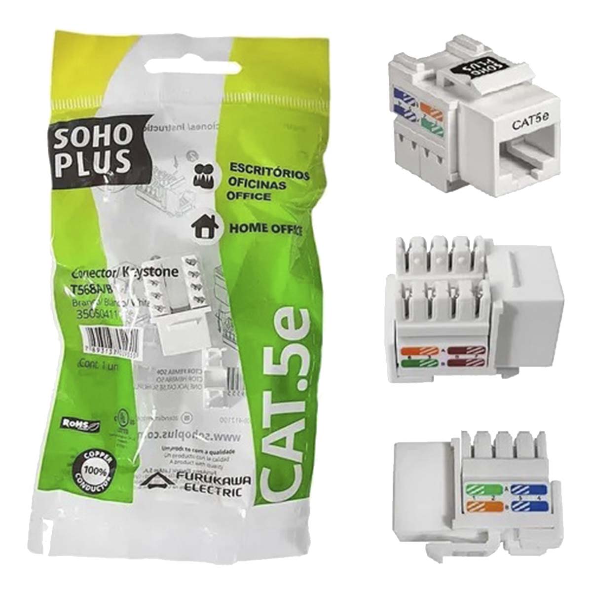 Keystone RJ45 CAT5E Sohoplus Sistemas de cabeamento estruturado para tráfego de voz, dados e imagen, seguindo requisitos da norma ANSI/TIA/EIA-568B.2, para cabeamento horizontal ou secundário. Ideal para uso interno, em ponto de acesso na área de trabalho para tomadas de serviços em sistemas de cabeamento estruturado.