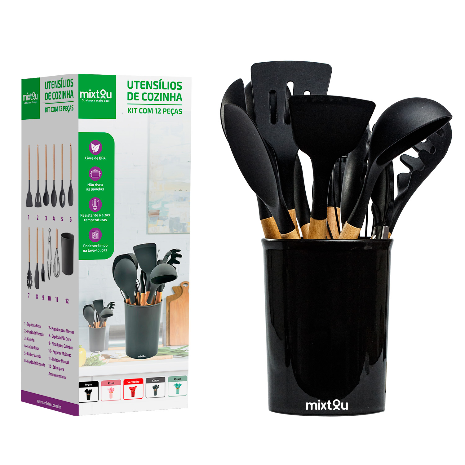 O kit de utensílios de silicone da Mixtou facilita o preparo das suas receitas com praticidade e resistência. Com 12 peças versáteis, é ideal para mexer, servir, virar, raspar e espalhar ingredientes sem danificar panelas antiaderentes. Suporta até 230 °C e traz mais agilidade e elegância para sua cozinha.