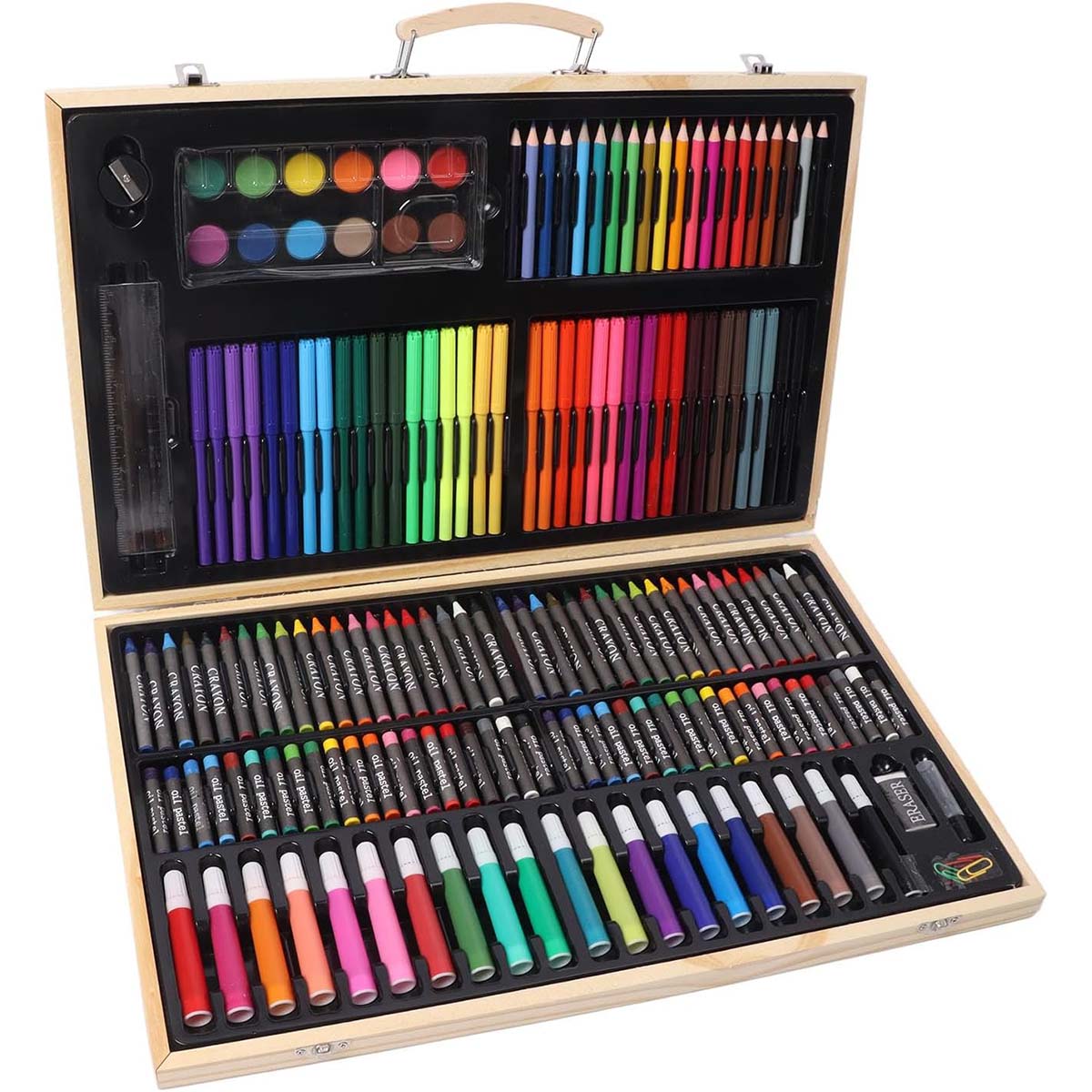 Todos os materiais estão organizados em uma elegante caixa de madeira, que facilita o armazenamento e o transporte. Ideal para uso em casa, na escola ou em viagens, mantendo tudo em ordem e acessível.