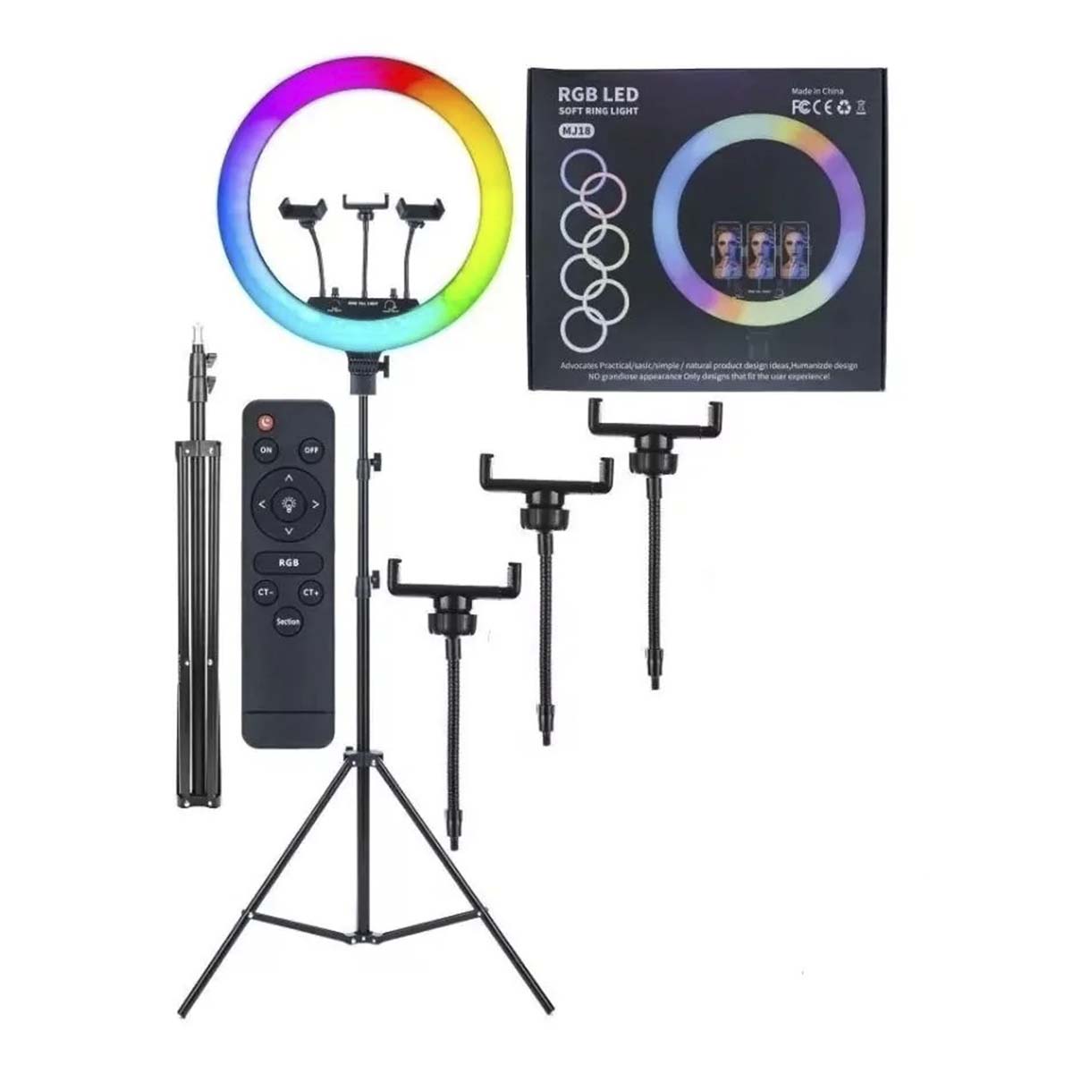 Incluído no pacote: Ring Light de 18, fonte de alimentação, controle remoto, três suportes de celular e um tripé ajustável, com altura mínima de 47cm e máxima de 190cm.