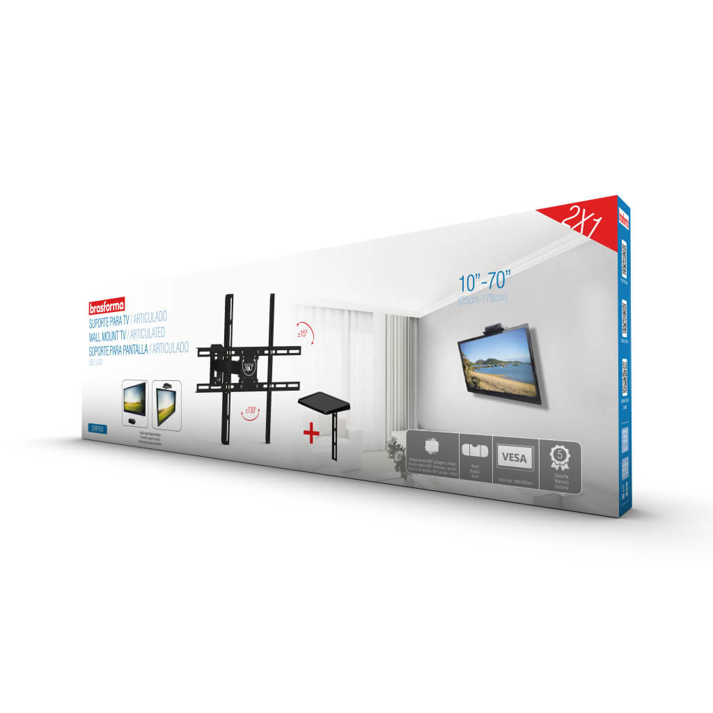 Suporte Articulado Brasforma para TVs LCD, LED, Plasma, 3D e Smart TV de 10 até 70 polegadas. Permite inclinação, articulação e rotação (3 movimentos). Permite Ajustar a TV para assistir de vários ângulos. Ideal para salas, escritórios, quartos, hospitais, restaurantes, entre outros locais.