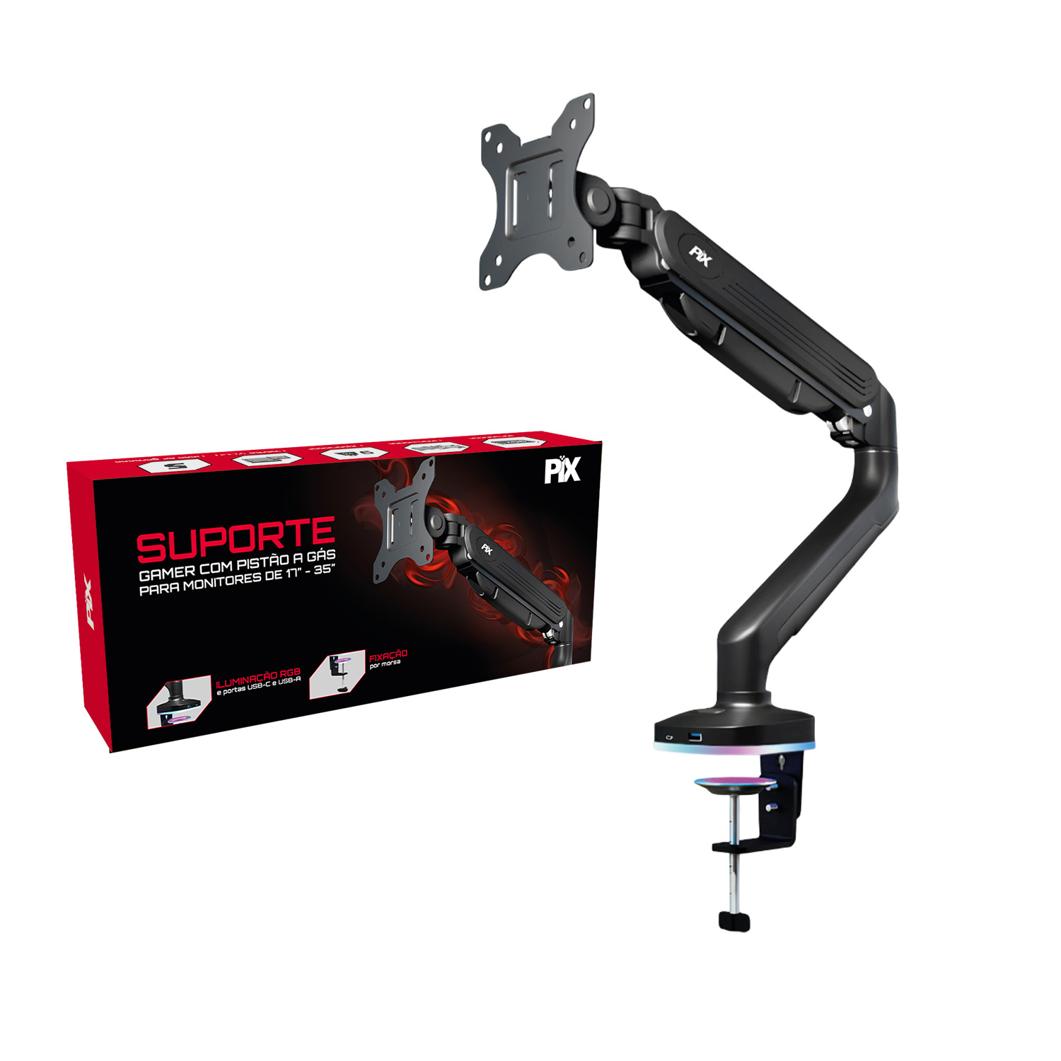 **Transforme sua experiência de uso com o Suporte Gamer com Pistão a Gás da PIX!** Este suporte foi projetado para proporcionar o máximo de conforto, desempenho e organização, permitindo que você ajuste seu monitor com facilidade e precisão. Compatível com monitores de 17” a 35”, ele é ideal para longas sessões de trabalho ou gameplay, promovendo uma postura ergonômica.
